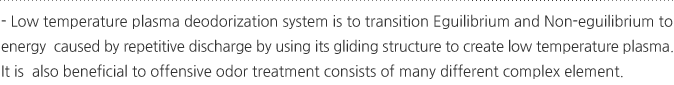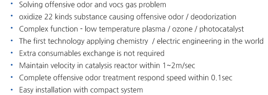 Reasonable driving cost Reasonable installation investment cost Applicable to almost all the type of offensive odor. No secondary pollutants. The smallest installation space. No pressure loss Available to all the offensive odor |